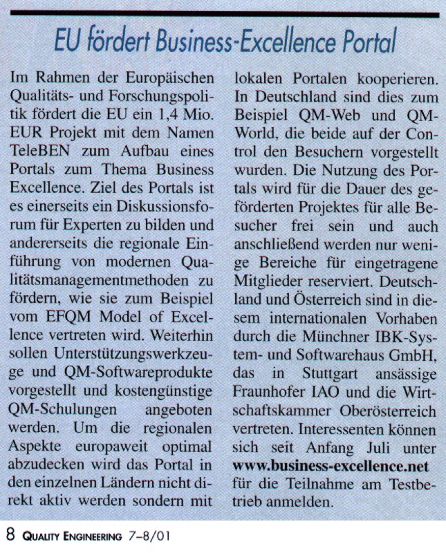| EU fördert Business Excellence Portal | Quality Engineering | 2001 | 8 | ||