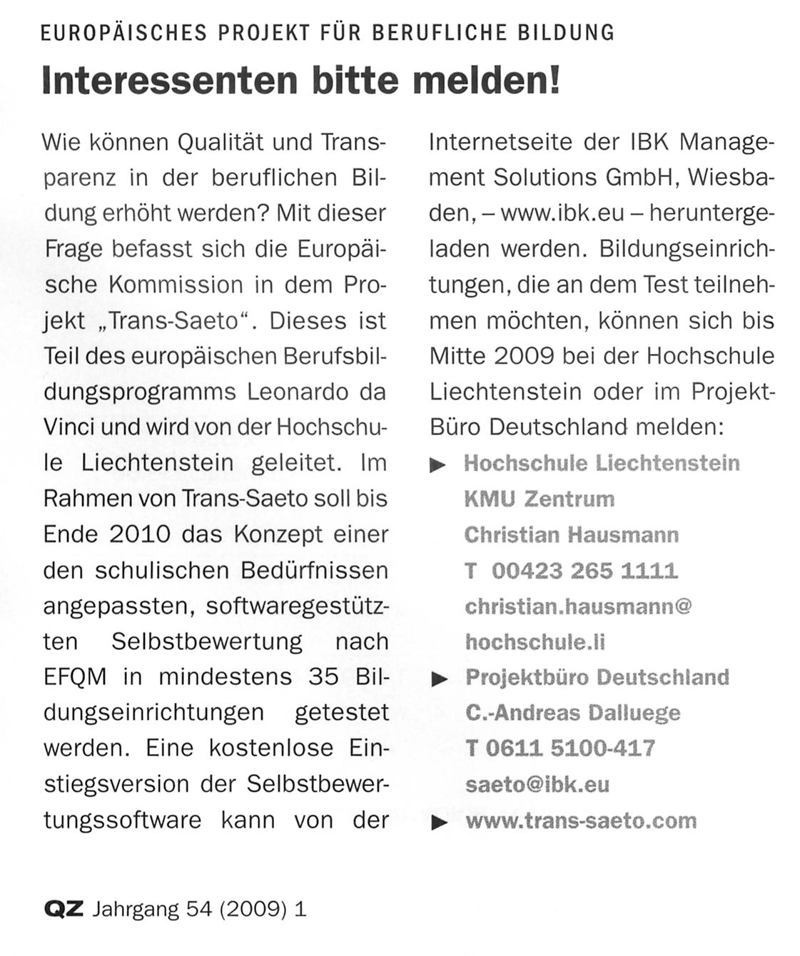 | Europäisches Projekt für die berufliche Bildung | QZ Qualität und Zuverlässigkeit | 2009 | 1 | ||